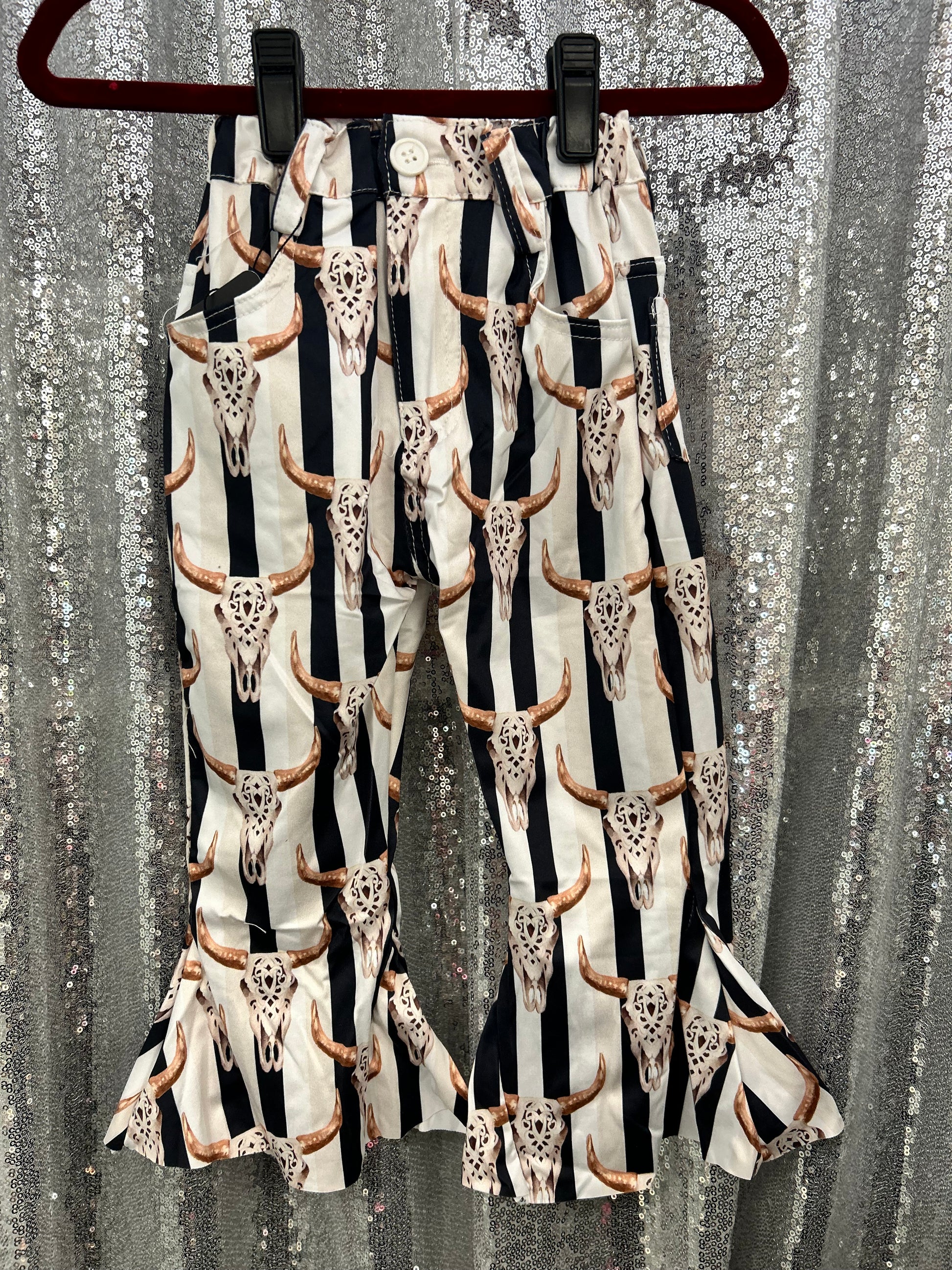 Black and White Striped Longhorn Skull Belle Bottom Pants w/ Belt Loops