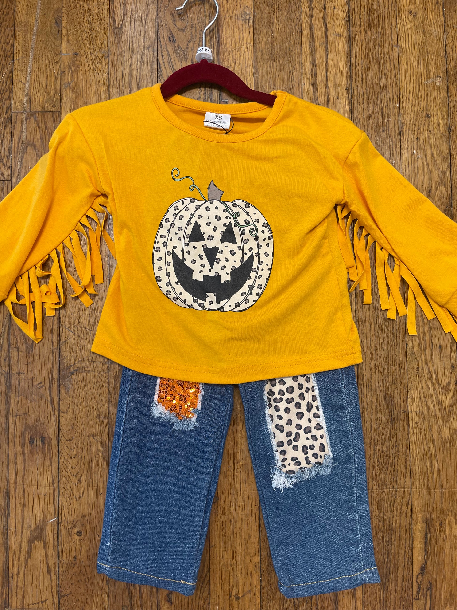 Long Sleeve Fringe Jack-o’-Lantern Top w/ Peek-a-Boo Jeans Halloween/Thanksgiving