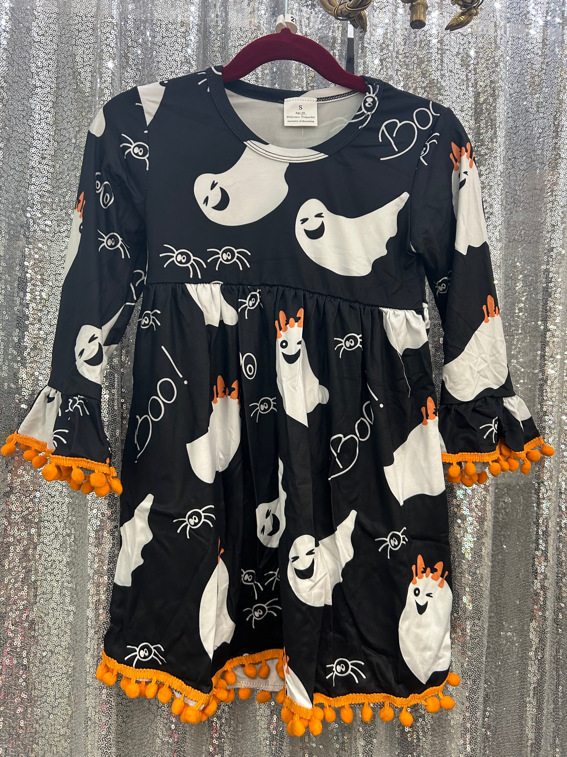 Long Sleeve Ghost “Boo” Dress w/ Orange Pompoms Halloween